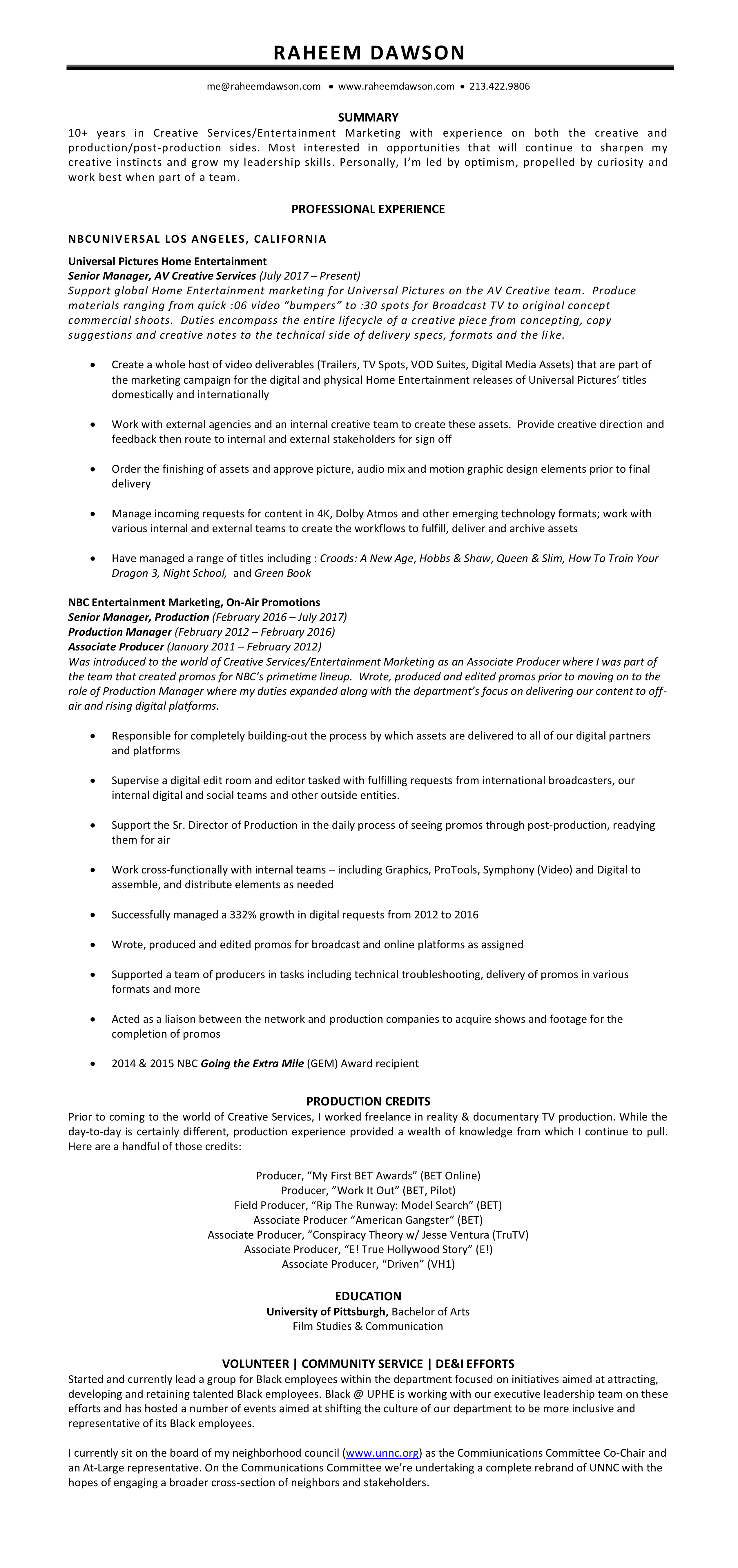In 2017, after about six years in TV Promo with NBC, Raheem made an internal move within the company to Universal Pictures Home Entertainment. As a Senior Creative Manager on the Marketing Team, Raheem currently manages the creation of AV assets that support the worldwide digital and physical releases of Universal Pictures titles.